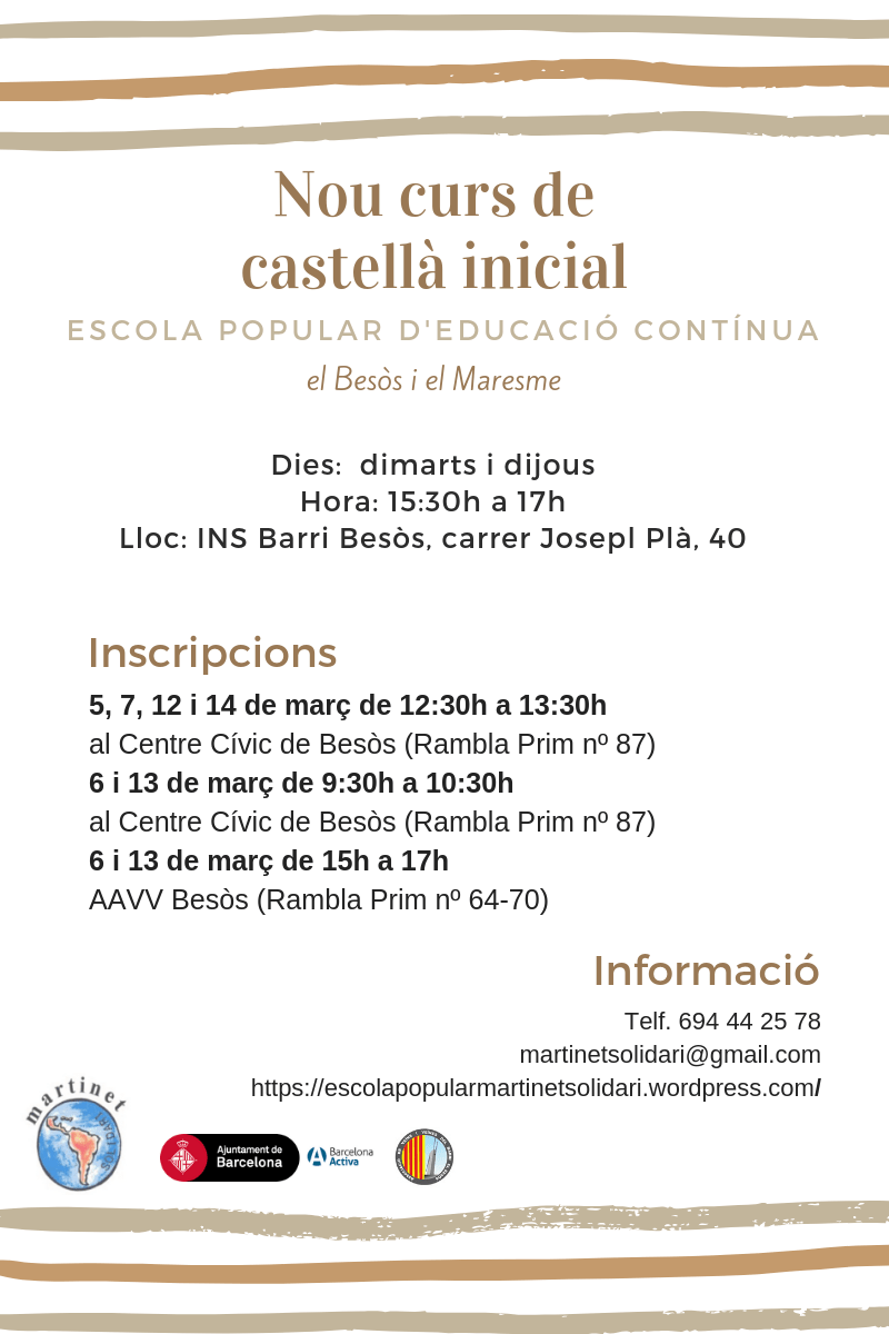 Les inscripcions es podran fer al matí, dimarts, dimecres i dijous, al Centre Cívic de Besòs. I a les tardes els dimecres a l’AAVV Besòs.