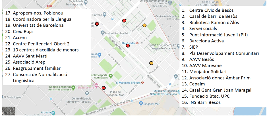 Equipament i Serveis Centre Cívic Besòs Casal de barri Besòs CFA Montserrat Roig Institut Barri Besòs Institut Rambla Prim Biblioteca Ramon d’Alòs-Moner Pla de Desenvolupament Comunitari Punt d’informació juvenil Barcelona Activa, Treball als barris Pla de Barris
